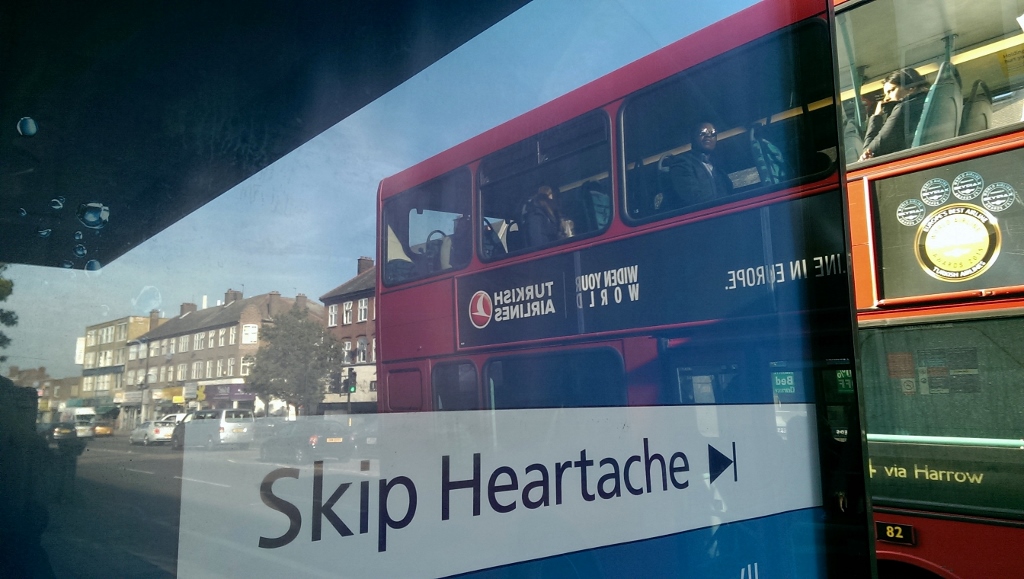It’s the two strangers on the top deck that get to me. The reflection against the glass siding of the bus stop shelter creates the illusion that they are seated facing each other, but invisible to each other. Or ignoring each other. In fact, one is sitting behind the other. It seemed/seems like such a perfect illustration of how life in London can be sometimes. We see each other, but we don’t. This, combined with the “skip heartache”. Well, it’s heartbreakingly perfect to me.
