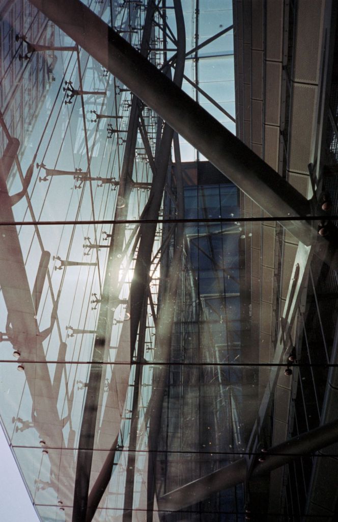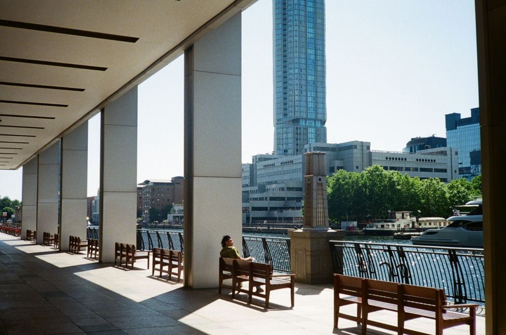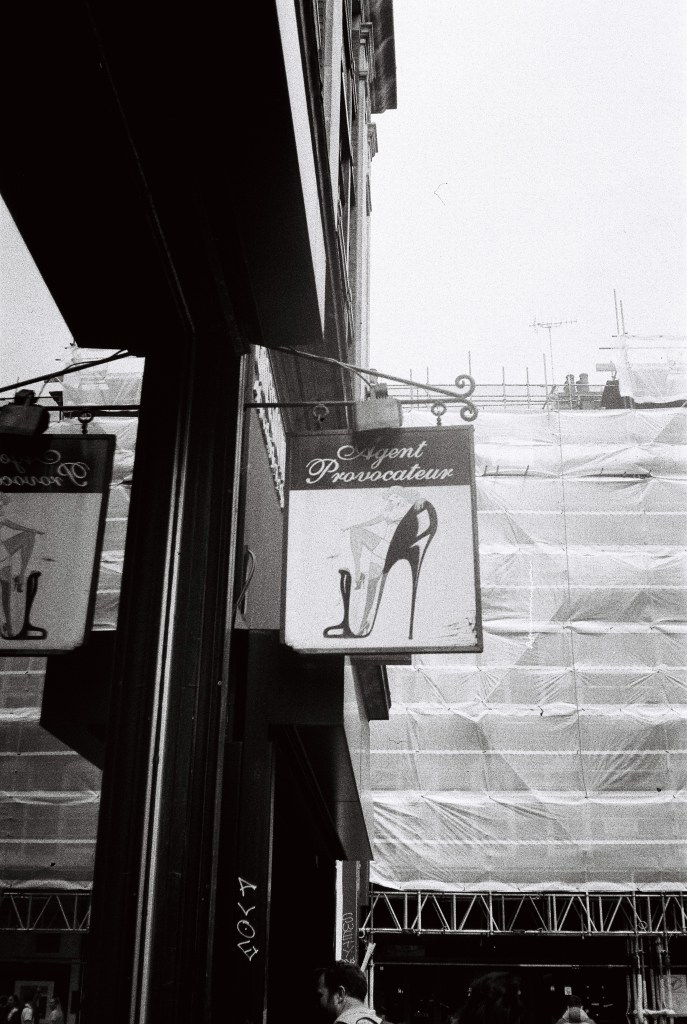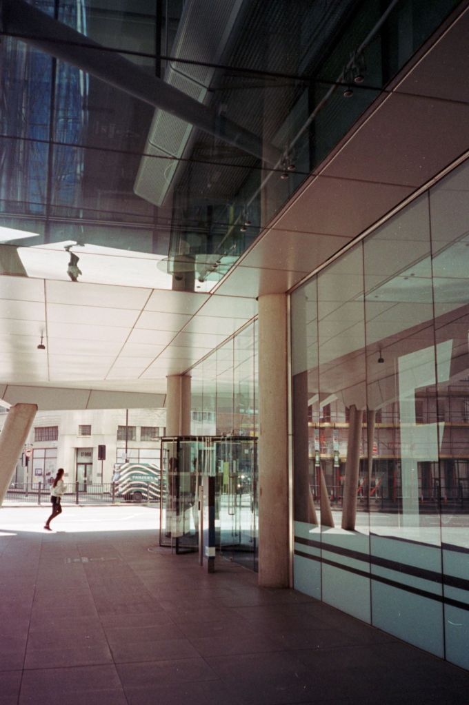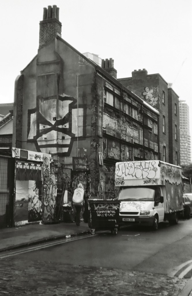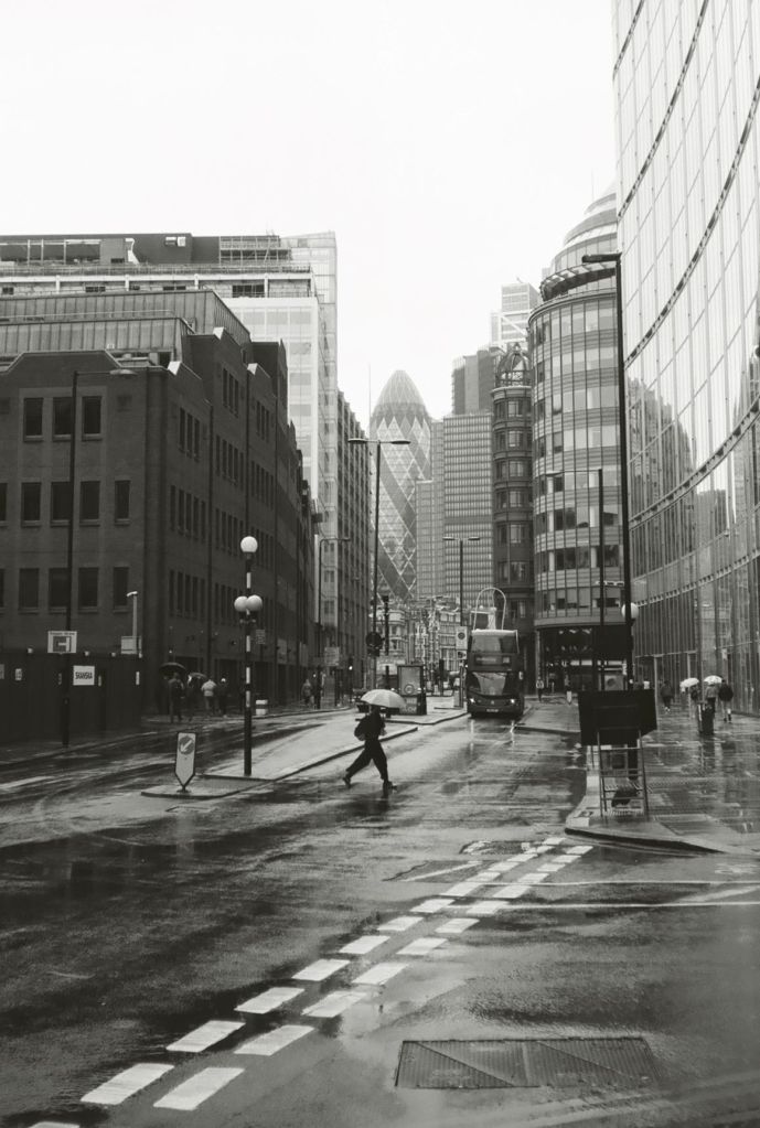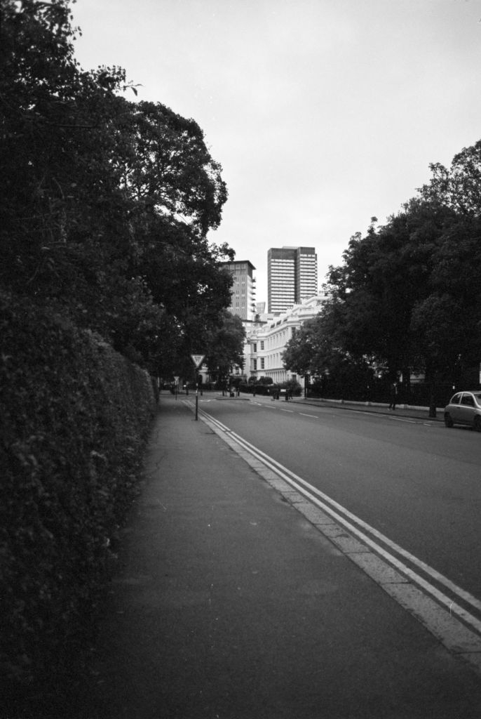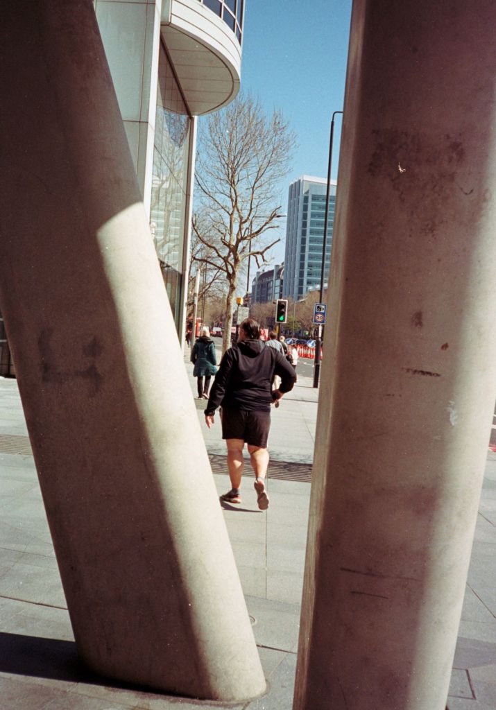 The sun is finally out. It drags me by feet out from under the heavy blankets of clouds that’s dominated our skies for endless weeks. A long walk begs; camera in pocket. I set off from Baker Street. I walk a little way down some mews, where the backs of buildings throw jagged grey triangles against the blue sky. Fasting moving clouds with somewhere else to be roll by. Somewhere in a security booth a guy monitoring local CCTV cameras is wondering what I’m looking at. I stand my ground as a construction worker approaches from down the way. “Hey.”