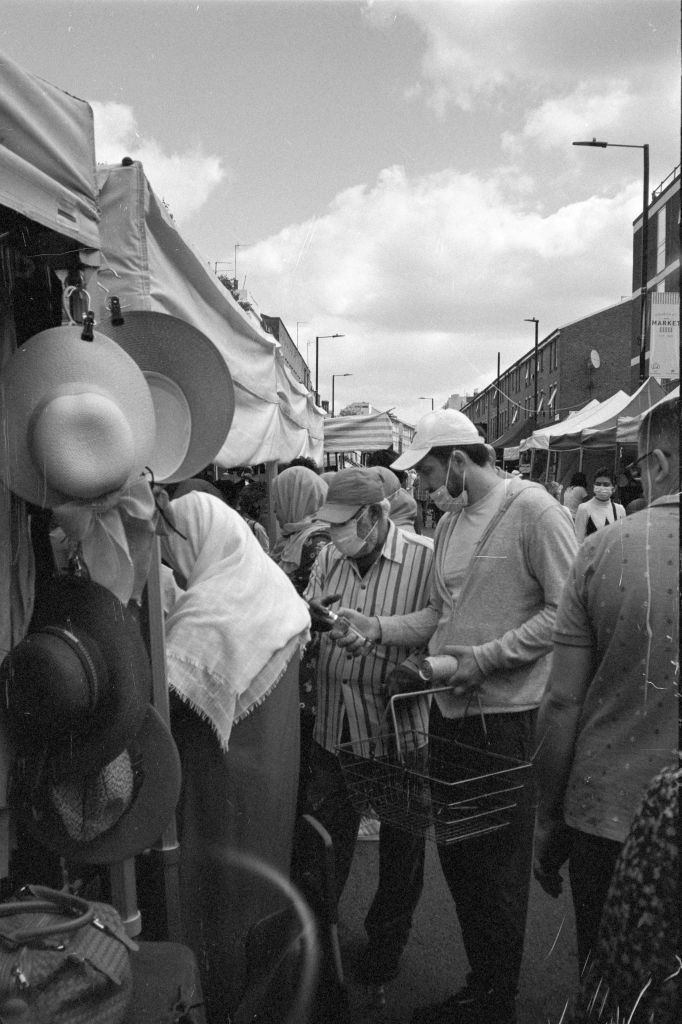 Two guys with acoustic guitars and aviator sunglasses sit cross-legged on the pavement outside the fabric shop. The scattering of market goers are completely ambivalent to their hungover-sounding off brand desert folk. The fishmongers are deep in conversation under their grubby canopy. Hands on hips. The sun gleams off rows of silver scales. Nearby people are gutting a huge pile of clothes; unseeing and wholly focused on a bargain. I slip around the corner and start swimming up the A5 towards Edgware Road.