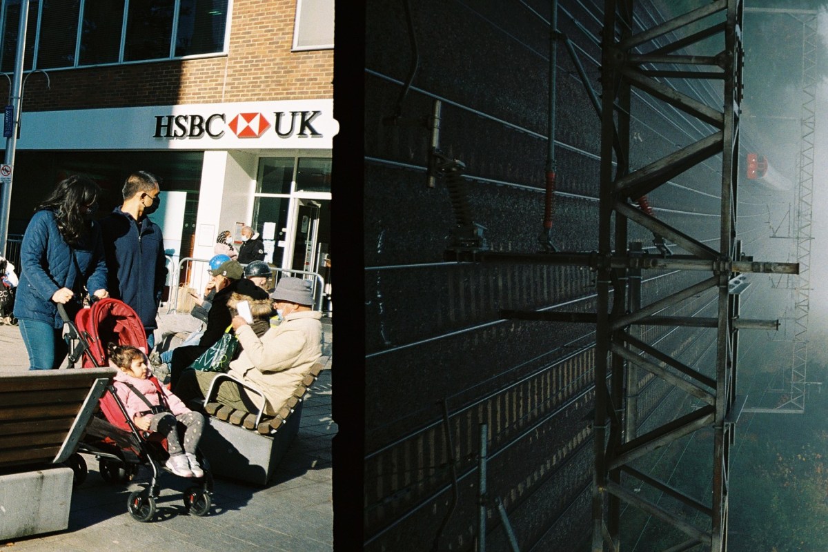 A block further, I get to another good spot I discovered the previous week. It’s equidistant from a pub and a bus stop, so I can pretend to be waiting for a bus. I’m just people watching really. In a building across the road, placards in the windows a few floors up spell out “NO JUSTICE, NO PEACE”. No one else seems to notice it. After a good few minutes, the perfect moment / subject comes along; success. [After having the film developed later in the week, it turns out it was taken on a double exposed frame, so this shot I was waiting whole minutes for was a bust – it happens. It was so perfect in my mind though.]